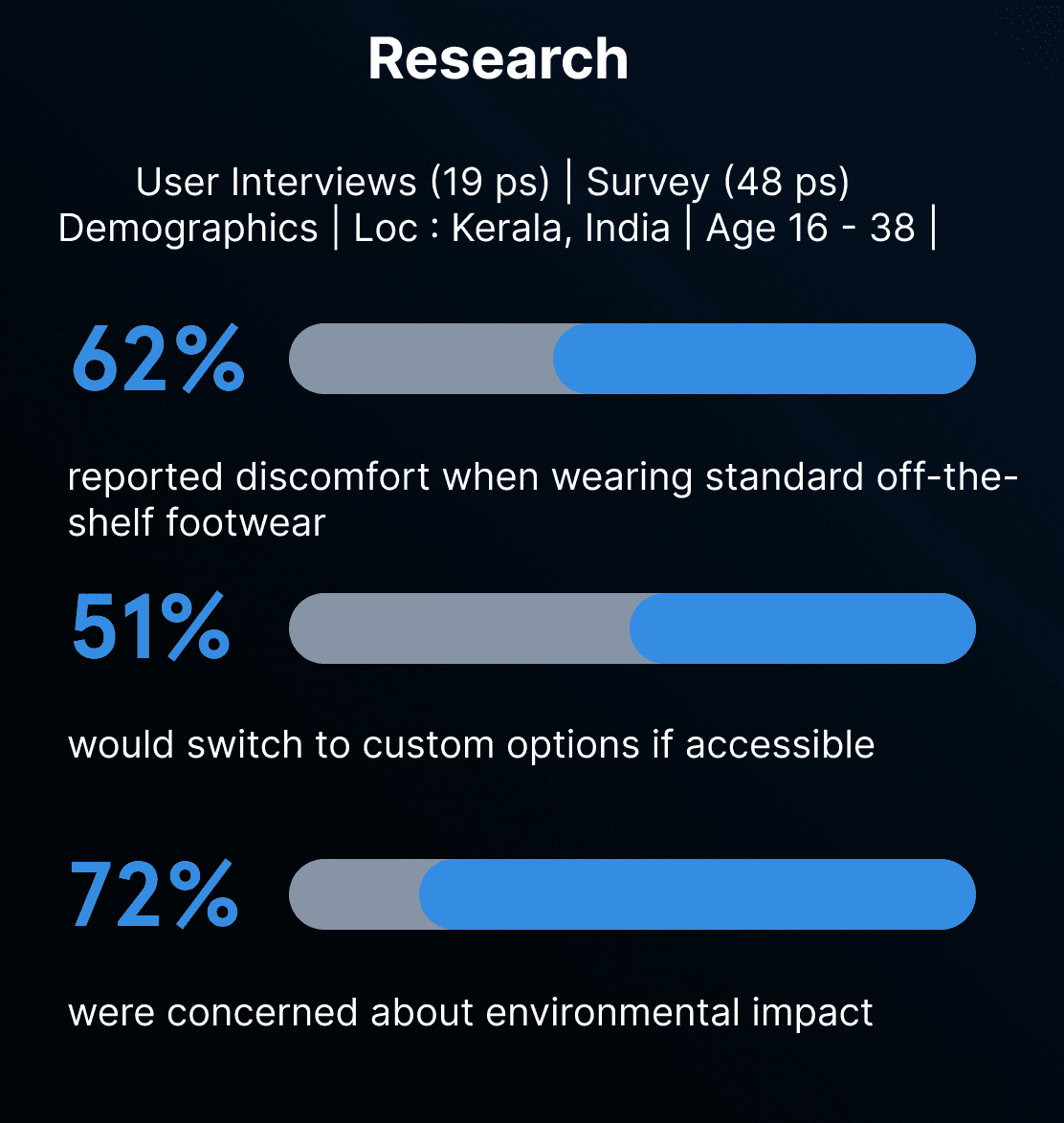 Feet vary a lot in shape, arch height, and proportions, which strongly affects how they move and bear load. Standard shoe shapes ignore this diversity, which helps explain why 62% of people in the study reported discomfort with regular off-the-shelf shoes.