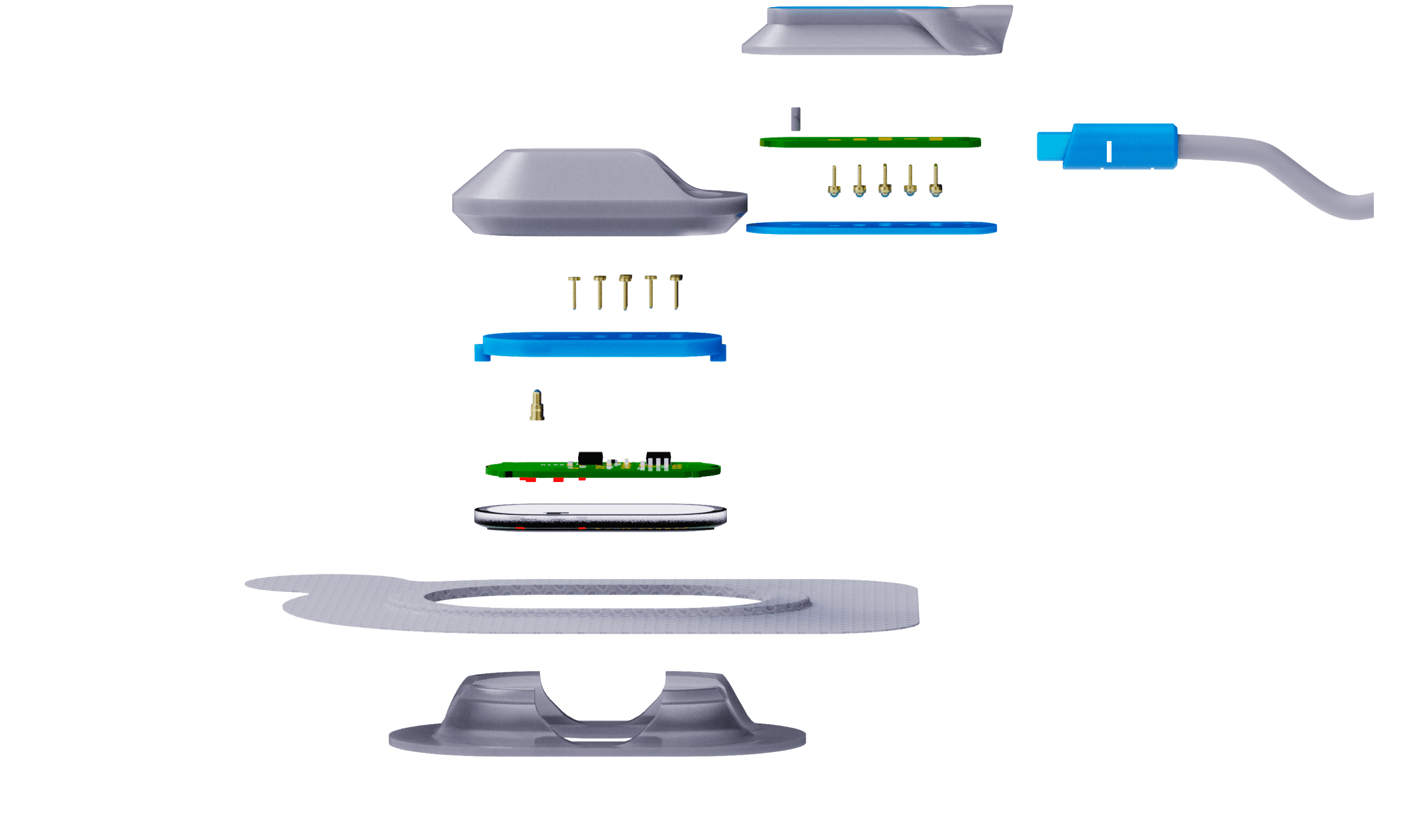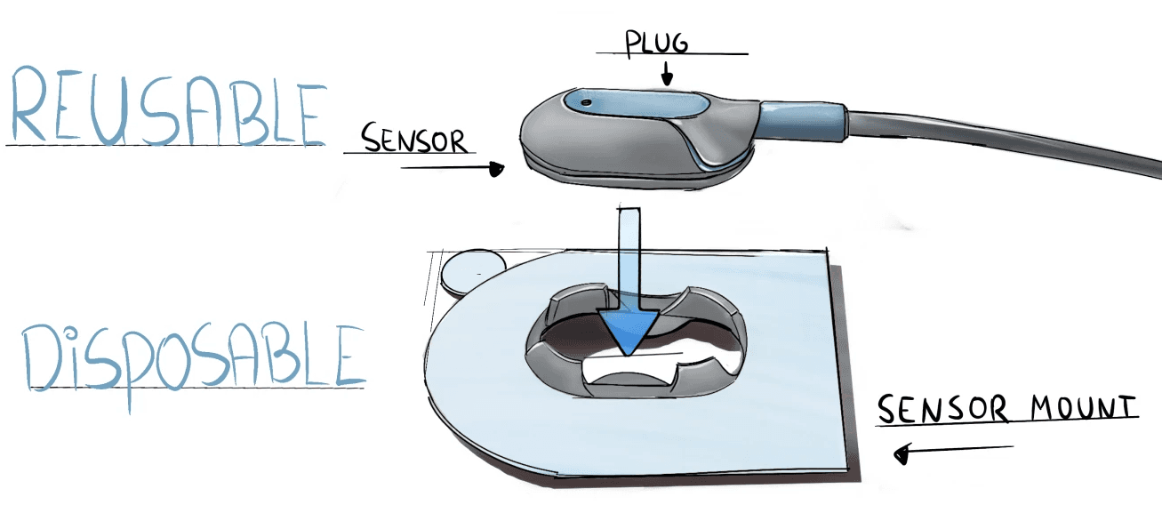 • Modularity: The system is split into three main parts: a reusable Plug (attached to the cable), a reusable Sensor (containing the electronics), and a disposable Sensor Mount (skin connection).