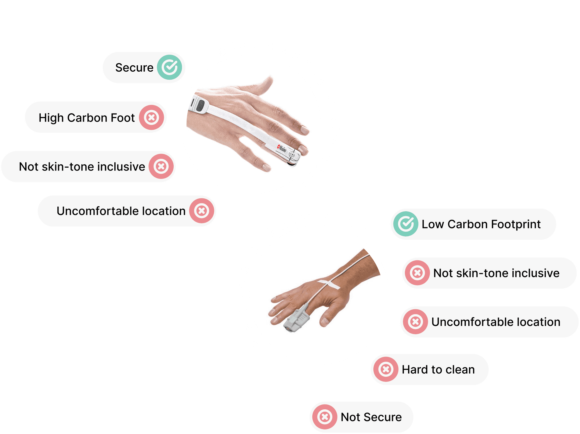 The use of reflective oximetry allows us to use as little advanced materials in the sensor mount as necessary, it specifically allows us to remove any electrical components out of the disposable part.