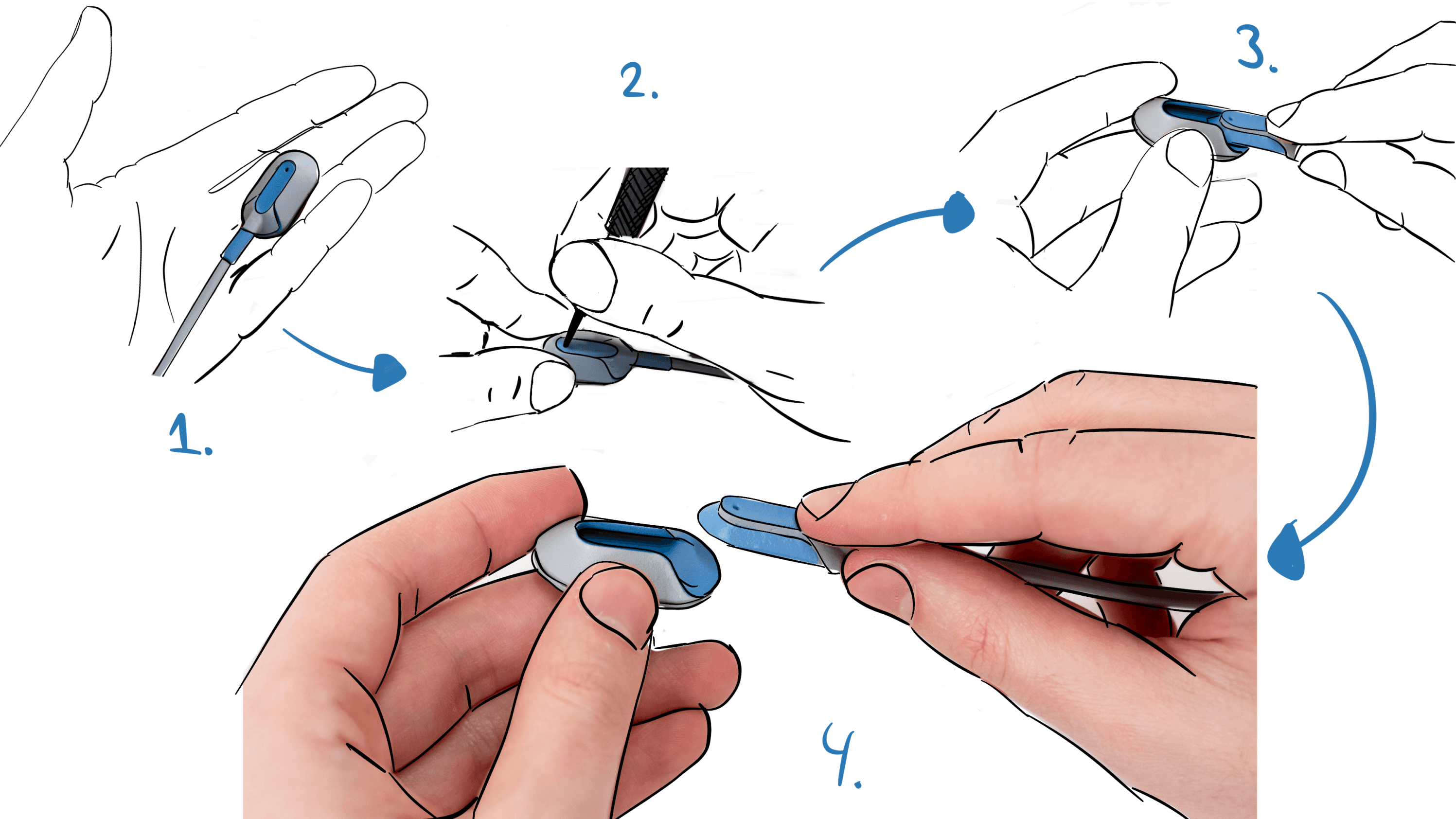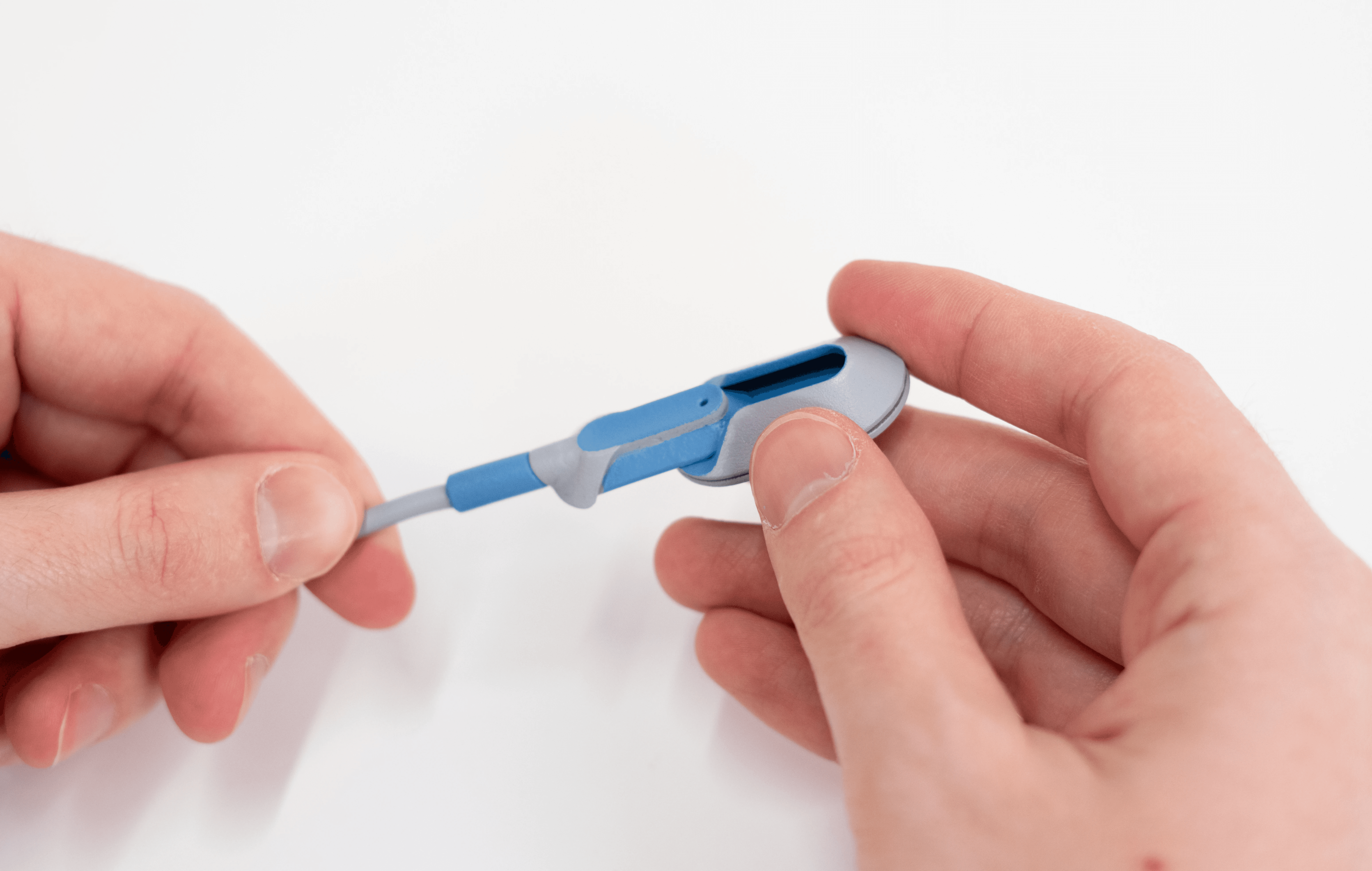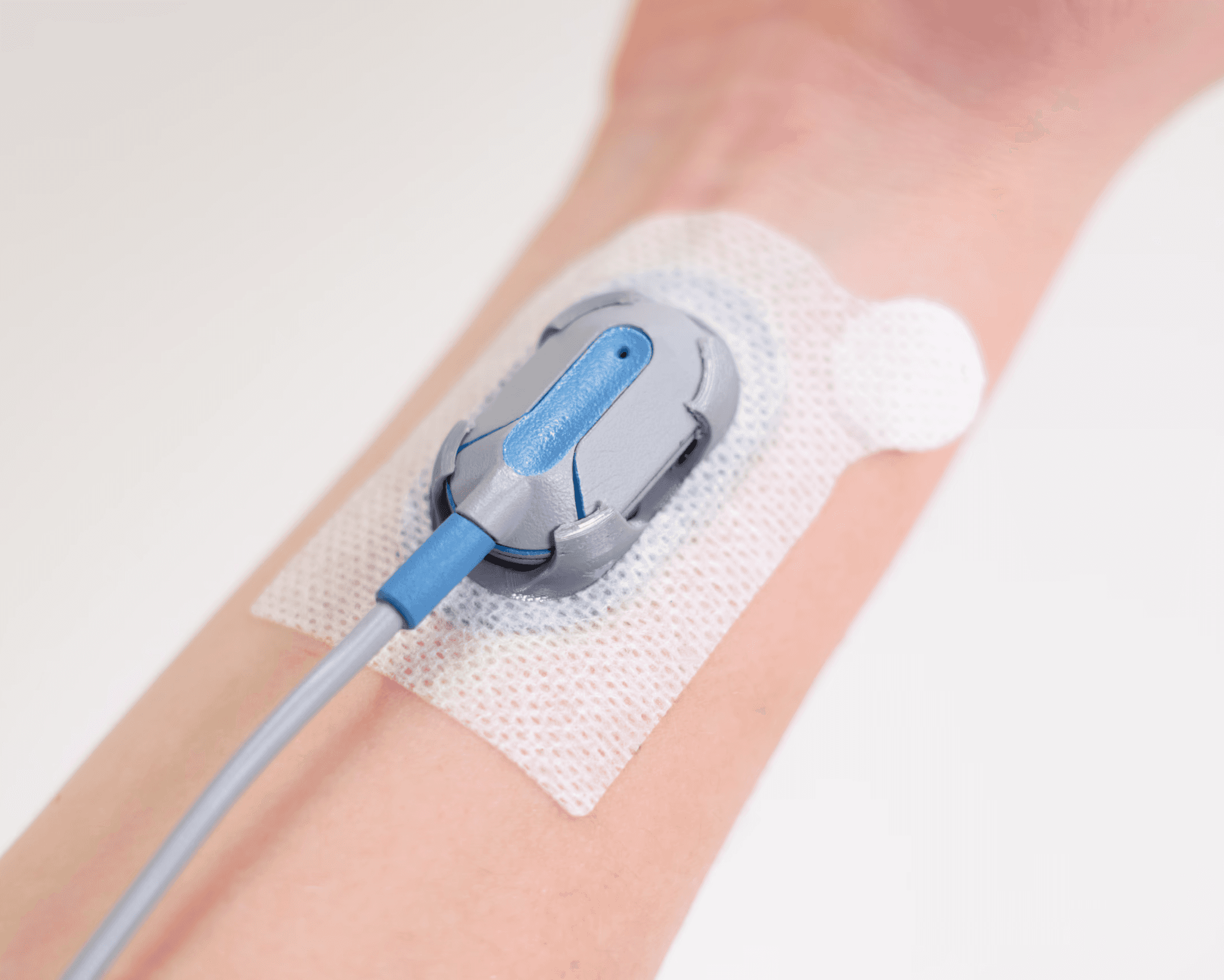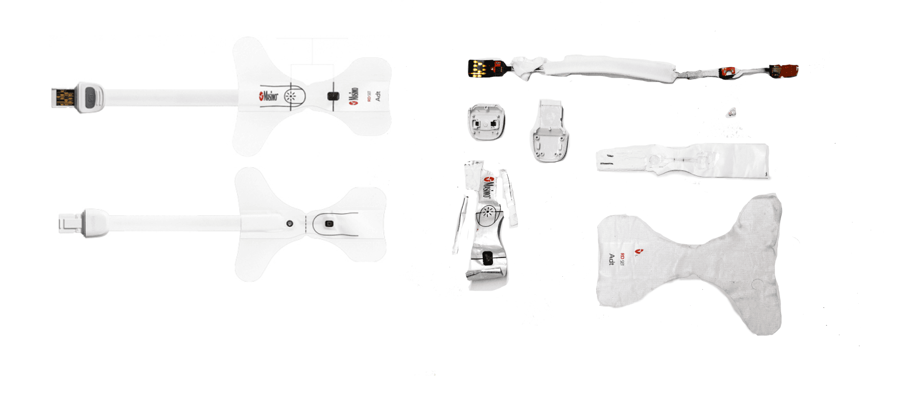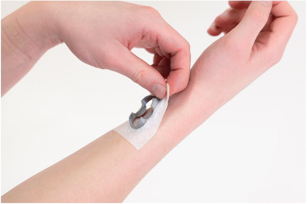 • Usability Features: The sensor mount uses a disposable adhesive sticker for secure attachment. The reusable plug attaches to the sensor via a sliding action and is designed to be released only by a simple pin tool, preventing accidental detachment while still being easily replaced for repair or maintenance. The device is symmetrically designed to work on both arms