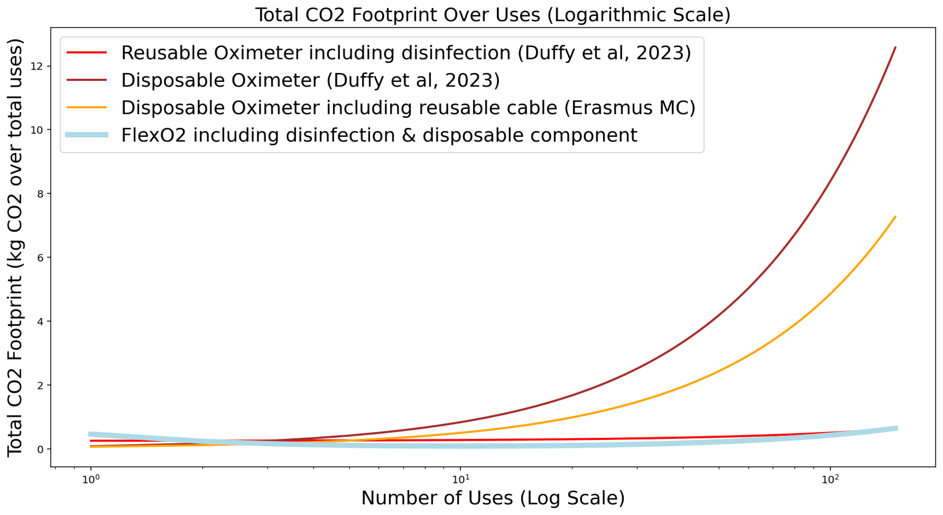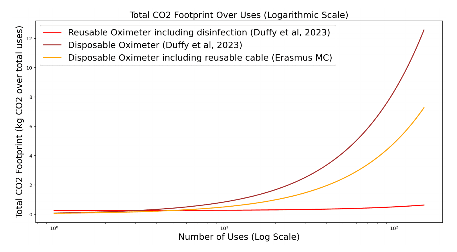 Life Cycle Assessment (LCA) research shows that a reusable oximeter only needs to be used 2.3 times before matching the emissions of a single disposable oximeter, strongly suggesting that pursuing a reusable solution is the most beneficial approach for sustainability.