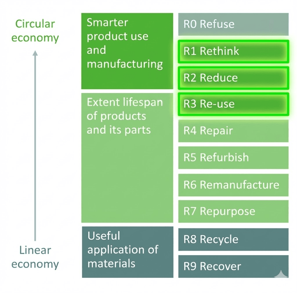 The team chose to focus on Rethink, Reduce, and Reuse (R1-R3) strategies, as opposed to competitors' focus on Remanufacture and Recycle (R5-R9), arguing that the former yield greater long-term sustainability benefits, especially by addressing transportation and packaging footprints.