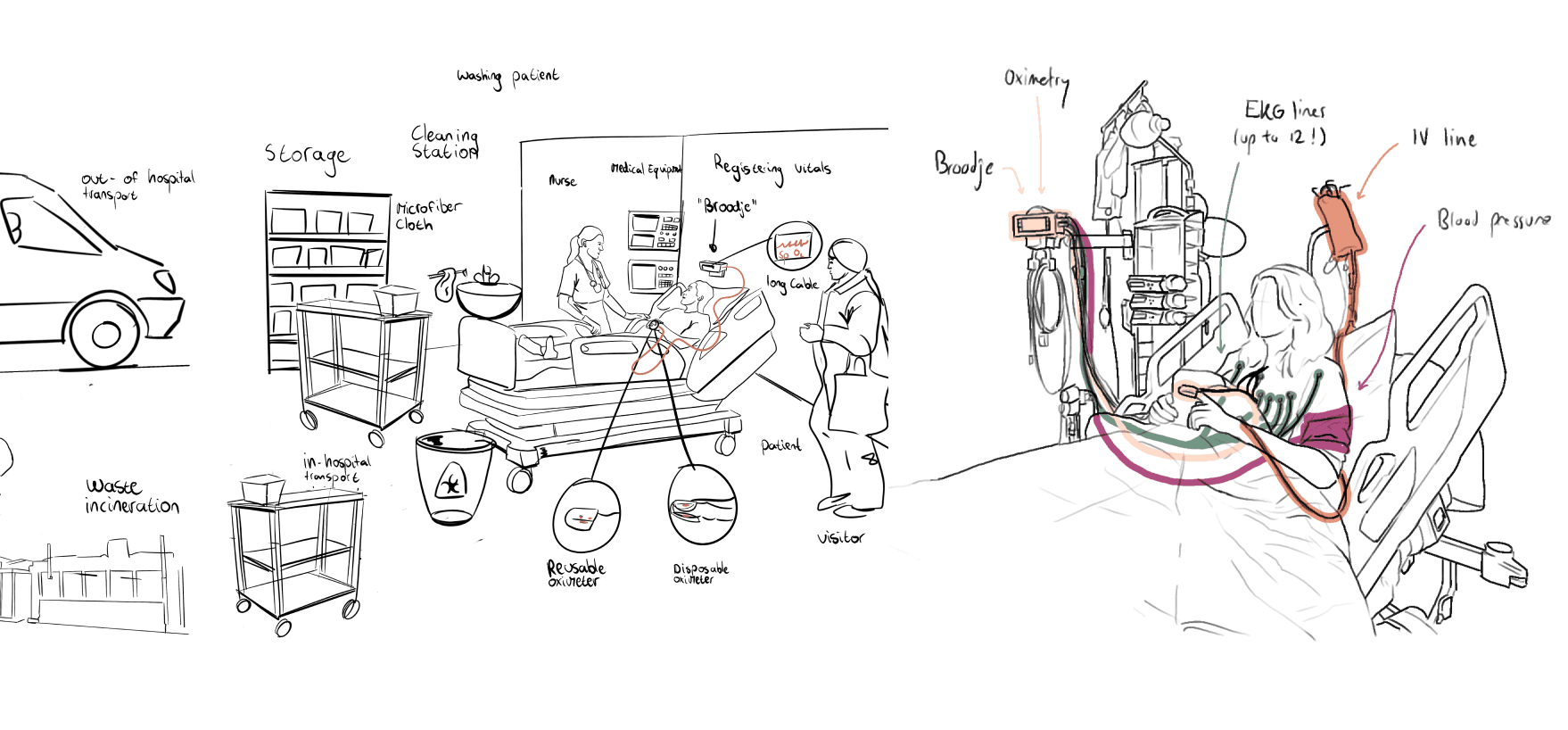 The project involved two phases of research, starting with exploratory context exploration, followed by in-depth individual research into six key topics: optimal measurement techniques (wavelengths, placement), environmental impact viability, R9 strategy integration, ergonomic placement, sustainable material alternatives, and user research with nurses